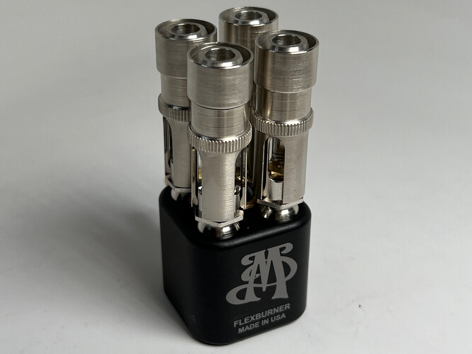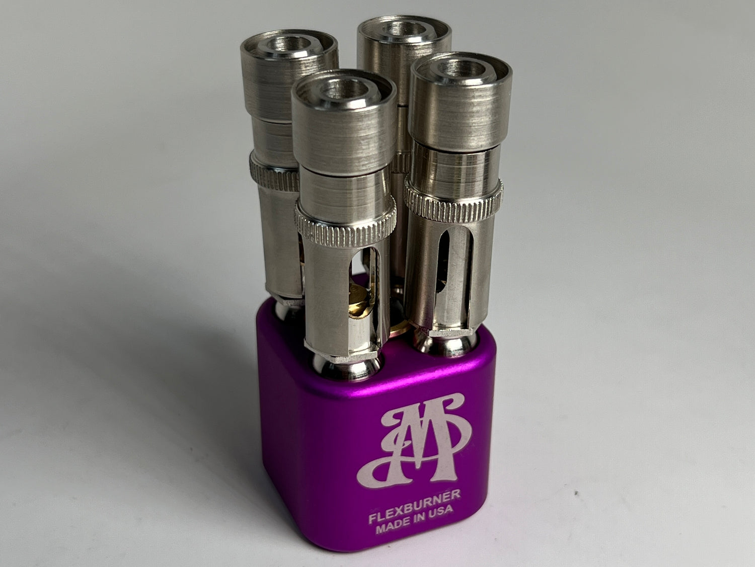 CNC machined billet aluminum body with four rotating burner tips allows huge flexibility in the heat distribution on the workpiece. The body has FOUR powerful neodymium magnets concealed in the base making the Flexburner extremely compact such a large flame coverage! The bottom is also threaded for screw attachment to a Flexmount or bracket.