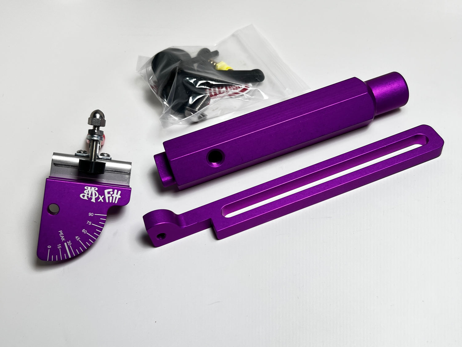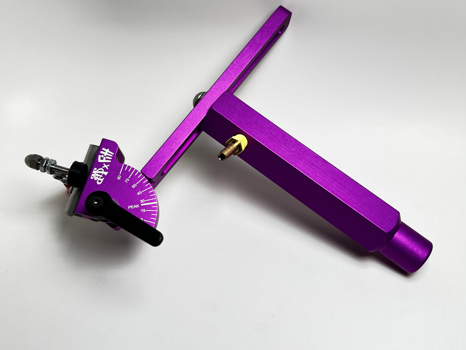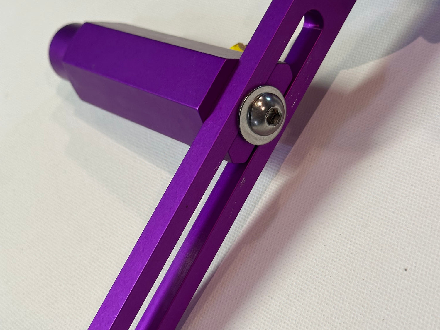 Anodized aluminum components utilize a toggle clamp to secure components at specific angles to the bore line using handles from 8-19mm diameter. Air passthru is accomplished thru the mandrel using the included 25mm Boroboot and barb fitting. Exclusive to this FAST device is a preset mark for accurately assembling tops to fit Puffco Peak e-rigs, one of Ryans specialties! Drive mandrel is sized to fit into all 50mm lathe/chuck bores.