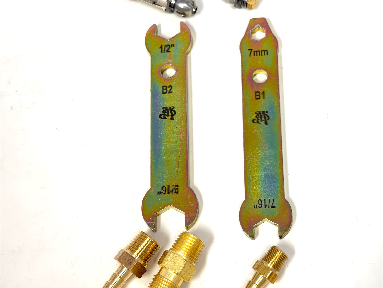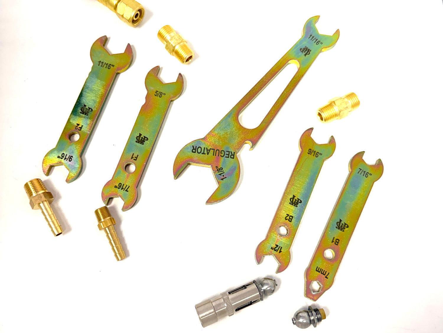 Wrenches specifically designed for glassblowers to fit the most common brass fittings and Madhatter burners. B series wrenches are used for service and repair of Miniburners and Flexburners. F series wrenches are for barbs and b fittings. Regulator wrench fits the large nut connecting regulator to fuel and oxygen tanks as well as the b style fitting and flashbacks commonly connected to the regulator output.